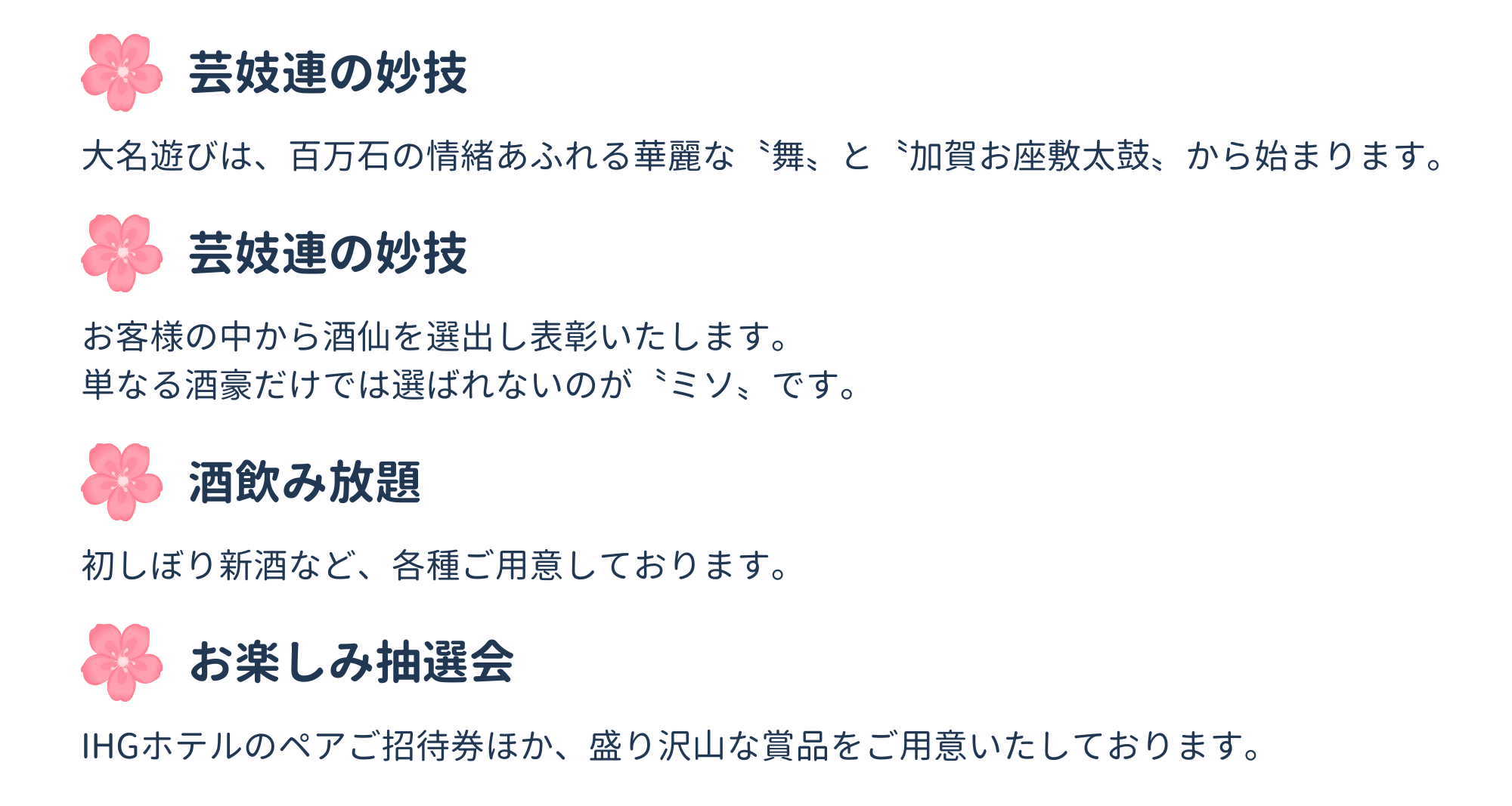 かなざわ芸妓連による華麗な妙技や、酒仙番付など、趣向を凝らした催しも盛りだくさんです。